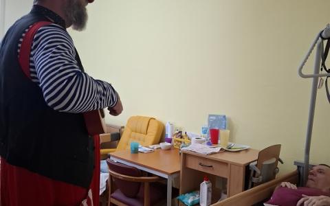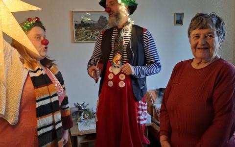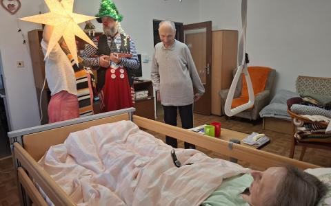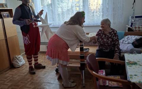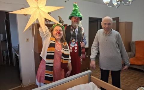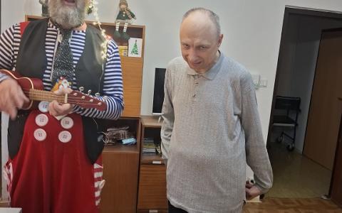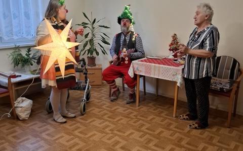 V piatok 19.12.2025 poslednýkrát v tomto roku navštívili naše zariadenie 2 zdravotní klauni z OZ Červený nos Clowndoctors – Gustáv a Želka prišli s túžbou doniesť a zaželať krásne Vianoce. Gustáv chcel byť vianočný stromček a Želka zase hviezda jasná. Spoločne s prijímateľmi si zaspievali, zaželali pod vianočnou hviezdou a aj ju sfúkli, aby sa želanie splnilo. Ďakujeme klaunom za krásny spoločný rok, za chvíle smiechu, radosti, dobrej nálady a tešíme sa na stretnutia v novom roku.