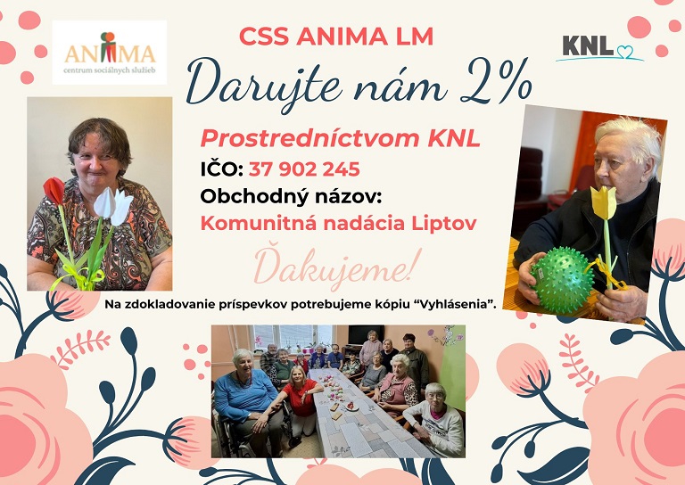 V prípade, že by ste nám chceli darovať 2 % z dane z príjmov, môžete tak urobiť prostredníctvom Komunitnej nadácie Liptov.