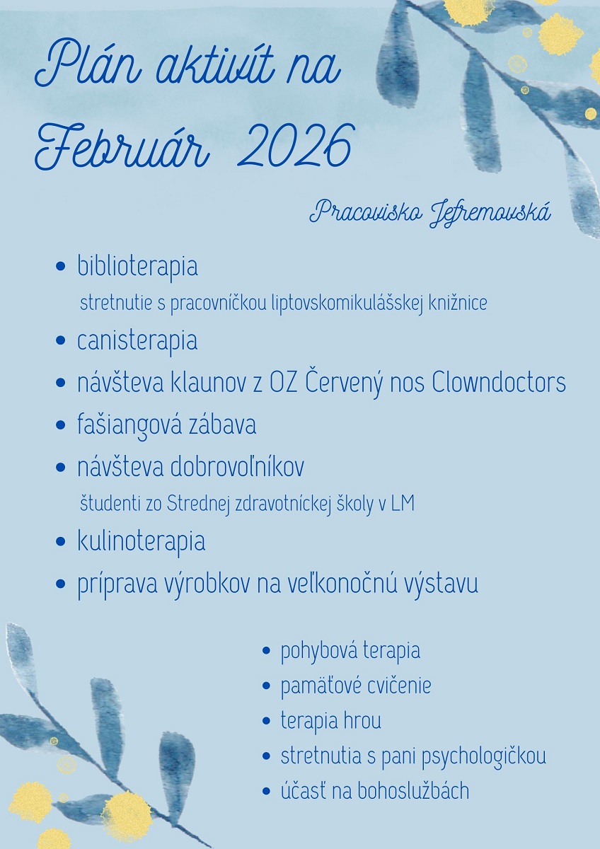 Plán aktivít na mesiac Február 2026 - pracovisko Jefremovská - Podbreziny